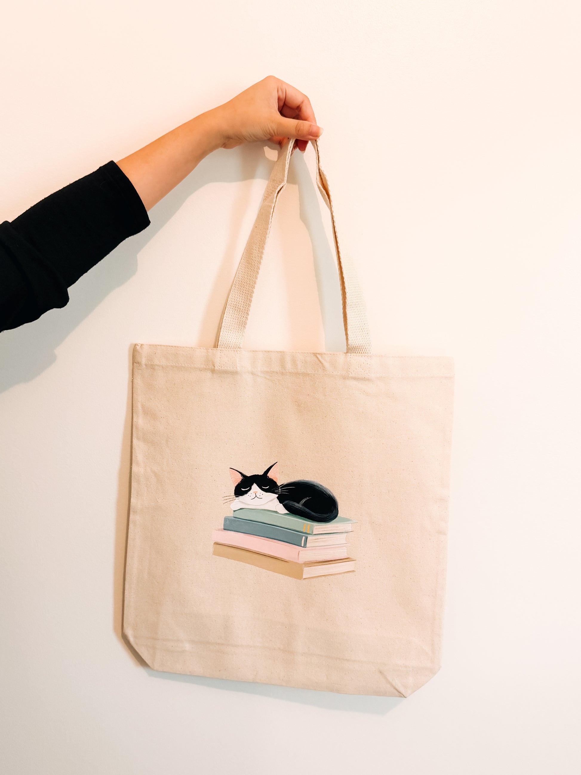 Carry your essentials with purr-fect style with our Cat & Books Tote Bag. Featuring a sleepy kitty perched atop books, this heavy duty tote is not only cute but also made from 100% cotton for lasting durability. A must-have for any book lover and cat enthusiast.
